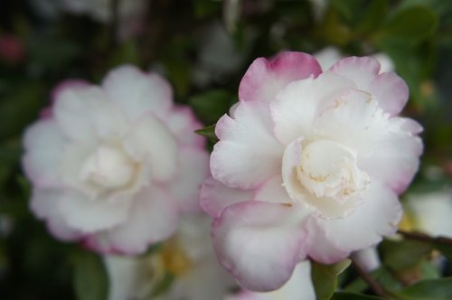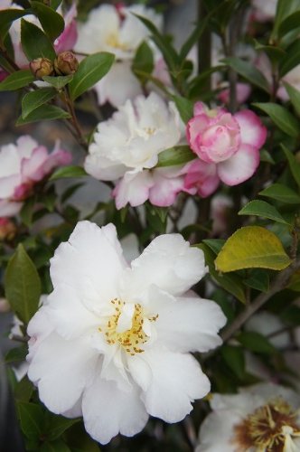 - ●品種の特徴白に紫の複輪のあまり出回らない品種。定番でよく生垣などに用いられます。秋から冬にかけて咲く清楚な花が特徴です。刈り込みに耐えるので、生垣や庭木の植え込みに好まれます。古い時代から親しみのある花木です。