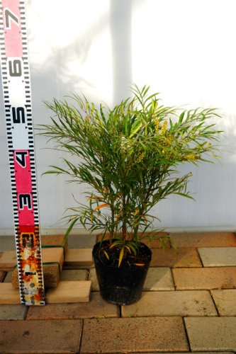 - ●品種の特徴黄色い小花が咲き、花後には青紫色の実が付きます。葉はヒイラギのように先が尖っていますがそれほど鋭くなく、細葉。並べてみると、“コンフューサー”より若干細葉。高さは1.5m前後まで生長します。「難を転ずる」という語呂合わせから、魔よけの木として信じられている縁起樹です。
