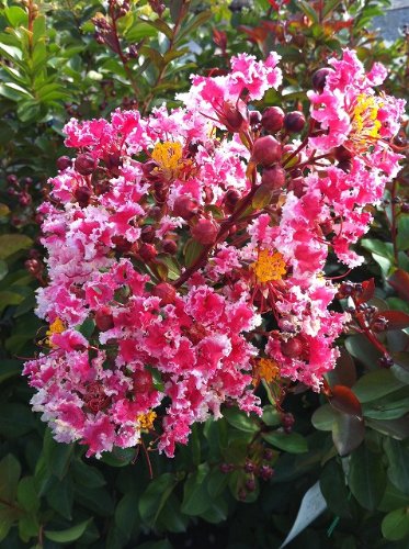 - ●品種の特徴:開花期の長い花も魅力ですが、なんといっても光沢のある幹はだが美しい。初夏から秋まで咲き続ける花も もちろん魅力です。明るい幹肌が印象的で洋風ガーデンにも良く合います。庭木のシンボルツリーにも最適です。