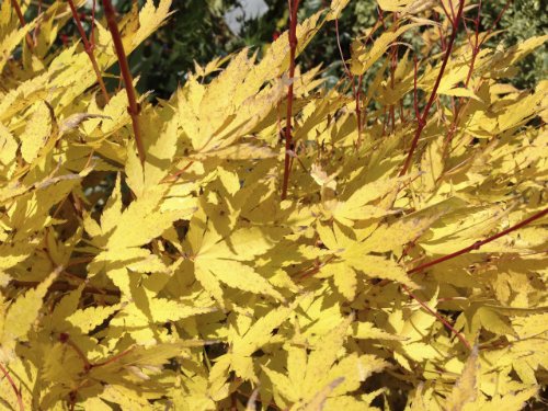 - ●品種の特徴今まで見たことがない幹肌を見せる品種。イロハモミジの園芸品種で、1年目の枝はオレンジ色に染まり、2年目の枝は黄色~クリーム色になります。秋からは黄色い黄葉を見せ、オレンジ色の枝とのコントラストは絶妙。樹勢が強く、よく生長します。他では見かけない1本です。