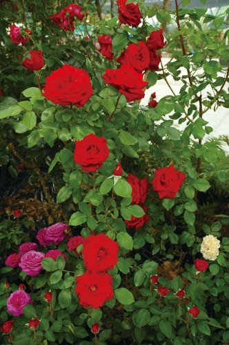 - ●赤のつるバラの最高品種。混じりけのない赤の花色は数ある赤バラの中でも比類ない美しさです。濃緑色の葉が赤の美しさをいっそう引き立てます。大輪系のヘルアツスの枝代わりで、「ヘル アツス」と同じく、花保ちがとても良いです。トゲが少ないので、とても扱いやすく、アーチに仕立てると美しい景観を楽しめます。