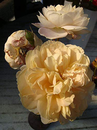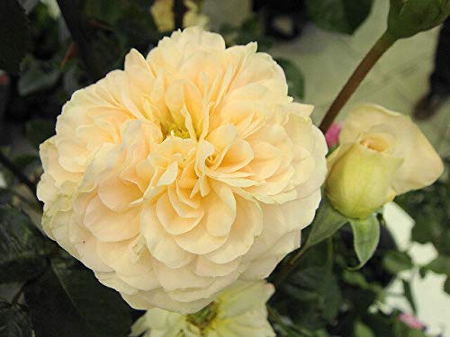 アプリコットのような、また、薄い黄色のような、やさしい花色のバラです。20輪もの房咲きになり、咲き始めはカップ咲き、咲き進むとソーサー型になります。イングリッシュローズによく似ていますね。ハーブの強い香りも楽しめます。