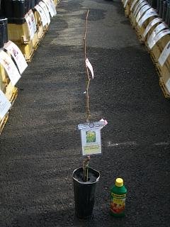 - ●果樹苗の形状苗木は1年生接木苗を4号ポットに仮植してあります。ポットも含め高さ0.7m位です。落葉期は葉がついておりませんが春に芽吹いてきます。この品種は1本で結実します。