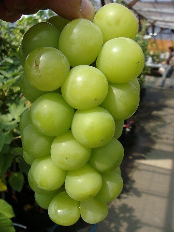 - ●品種の特徴皮ごと食べられ、香りよく1果8~12g程の大粒。マスカット香の爽やかな柔らかい黄緑色の果実は、黄色みが強くなるとより美味しくなります。かたく締まり食味よく、短い楕円形で巨峰より日持ちがします。ウィルスフリー台木に接木してありますので病気に強いです。収穫は9月上~下旬。