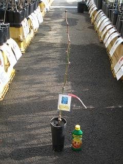 - ●果樹苗の形状苗木は1年生のウィルスフリー接木苗を4号ポットに仮植してあります。ポットも含め高さ0.5~0.8m位です。落葉期は葉がついておりませんが春に芽吹いてきます。この品種は1本で結実します。