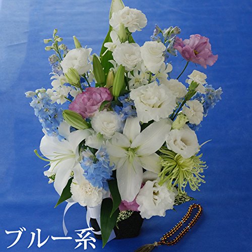 お供え 花 アレンジメントの解説 ・基本形は白とブルー、を基調した、お供え用のアレンジです
