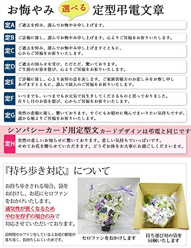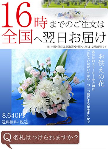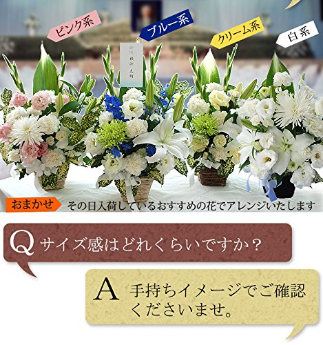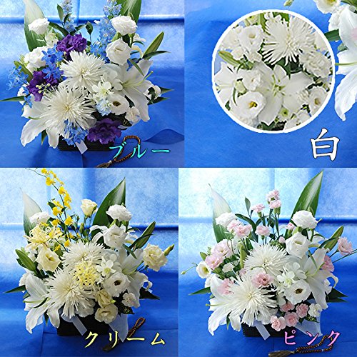 お供え 花 アレンジメントの詳細 使用素材 新鮮な季節の生花 制作方法 すべてご注文いただいてから制作します ギフト対応 商品はすべてギフト対応です。8640円以下のものはご希望によりセロファンラッピングいたします 仕様 段ボールの箱でお届けします ご希望によりメッセージカードは無料でお付けします。 ご希望により名札をお付けします。弔電を同梱いたします(オプション+500) サイズ 約37×44センチ 色展開 ブルー系 ピンク系 クリーム系 真っ白 ミックスなど5色から選べます