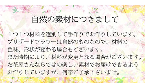喜ばれる相手 母、祖母、義母、先生、祖父、姉、妹、友達、彼女 マッチする年代と性別 女性、男性、20代、30代、40代、50代、60代、70代、80代、90代 イメージ 可愛い、きれい、インスタ映えする、植物標本、癒し、和風 用途 敬老の日、誕生日、還暦祝い、結婚祝い、卒業祝い、事務開店祝い、就職祝い、出産祝い 飾る場所 玄関、リビング、デスク、テーブル、廊下、吹き抜け、事務所、店舗