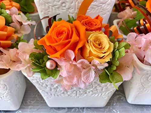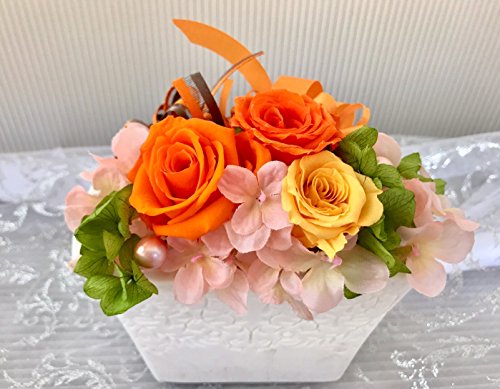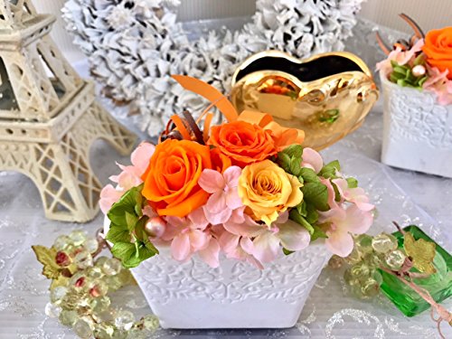 ハンドメイドで丁寧に制作した花メロディーオリジナル商品です。ギフト、お祝いごとにピッタリな白陶器の枯れない花・プリザーブドフラワーです。リボンで可愛いアレンジメントを施した高級感溢れるプリザーブドフラワーです。カラーバリエーションは人気のピンクとオレンジの2色です。 クリアケース付きなのでそのまま飾ることが可能です。汚れやほこりが入る心配がなく長持ちします。 生花に特殊加工を施しているためきれいなまま長期間保つことができます。花粉がでることもないのでどんな方にも安心して飾っていただけます。 お見舞いなどにも人気の商品です。