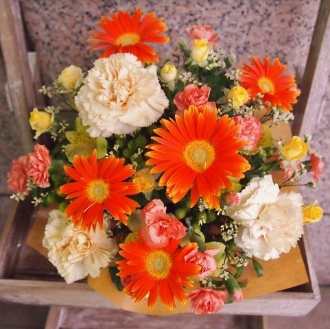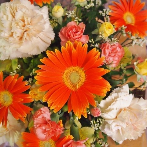 - サイズ(奥行:約23cm×幅:約23cm×高さ:約23cm) メイン カーネーション・ガーベラ その他 季節のお花でお作りします。 ご希望があればお持ち帰り用袋お付け致します。