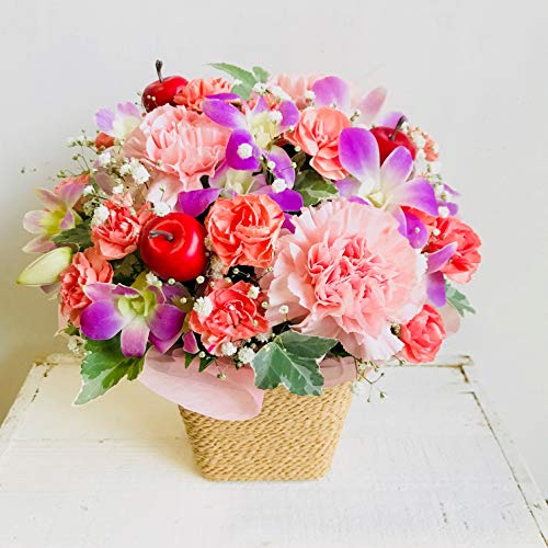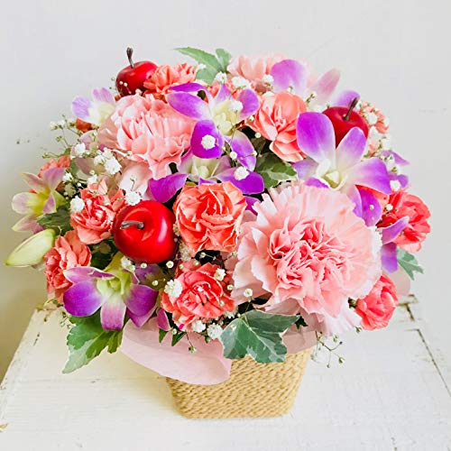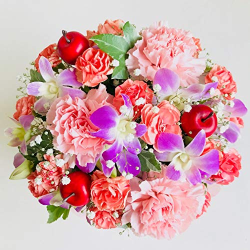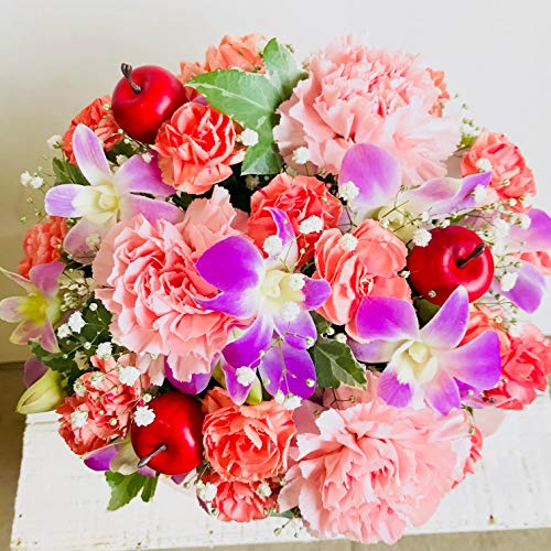 - サイズ(奥行:約21cm×幅:約21cm×高さ:約21cm)花材 メイン 洋ラン・カーネーション・カスミソウ・ その他 季節のお花でお作りします。 入荷の状況によって多少花材変わることがあります。画像のイメージを損なわないよう制作致します。ご希望があればお持ち帰り用袋お付け致しますのでご連絡下さいませ。