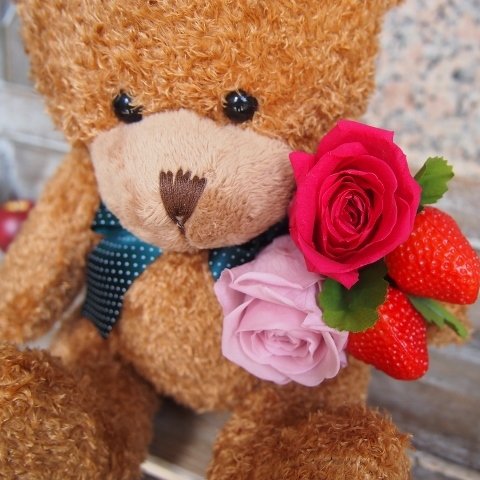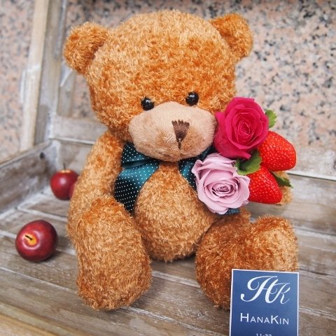 高岡大仏前花金 プリザーブドフラワーアレンジメント お花くまさん(茶くま イチゴ ピンク2種のバラ)(サイズ 幅 17cm 高さ20cm )プリザーブドフラワーアレンジメント 誕生日 お祝い 母の日 父の日 敬老の日 還暦