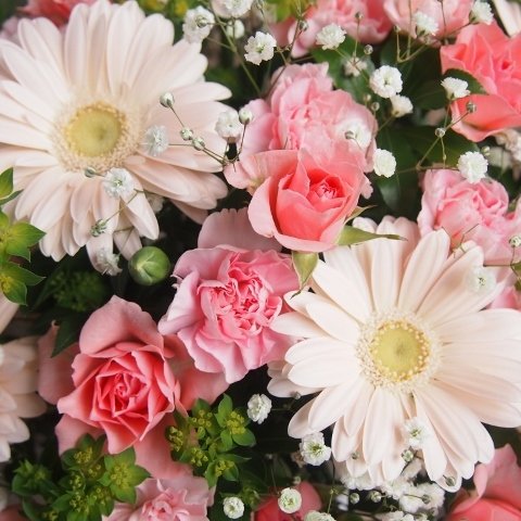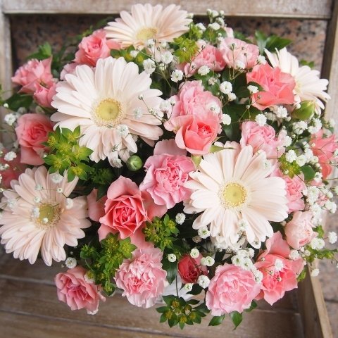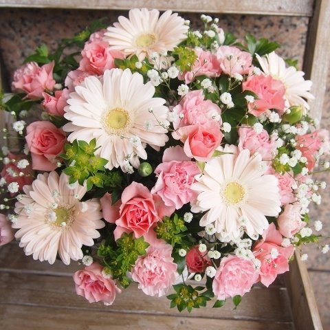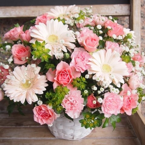 ピンクのグラデーションカラーで明るく華やかに制作しています!! バラ・ガーベラをメイン花材にボリューム良く仕上げました! 綺麗にお花が入っており、お客様に喜ばれるデザインとなっております! 誕生祝い・歓送迎会・発表会など、あらゆるシーンの贈り物にどうぞ! 商品は画像イメージ通りに作成致しますが、花材により若干仕上がりが異なる場合がございます。