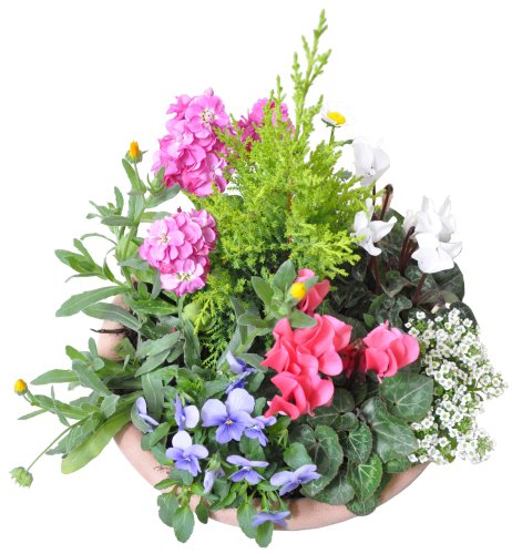 - 冬から春にかけてお楽しみいただけるゴールドクレストを中心にガーデンシクラメンやパンジーを使用して可愛らしくアレンジしています。クリスマスの装いにピッタリです!!