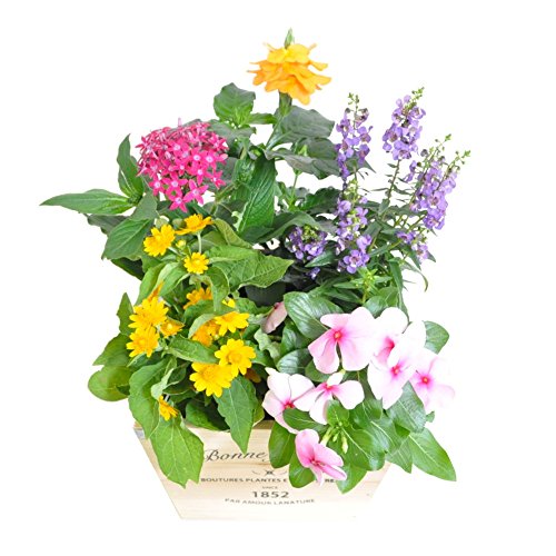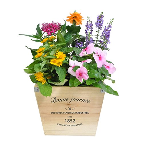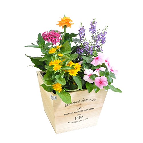 - 季節の苗をを杉の木のウッドポットに寄せ植えアレンジ。受注後、状態の良い5~6種類の花苗を使用してプロがアレンジして、根が馴染むまで生産元で管理を行ってから出荷をします。