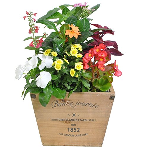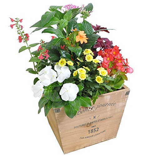 - 季節の苗をを杉の木のウッドポットに寄せ植えアレンジ。受注後、状態の良い7~8種類の花苗を使用してプロがアレンジして、根が馴染むまで生産元で管理を行ってから出荷をします。