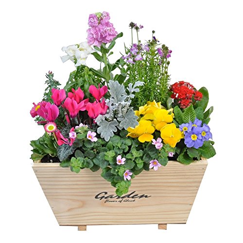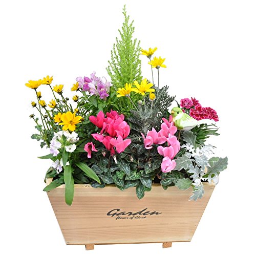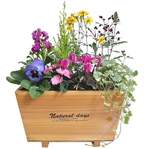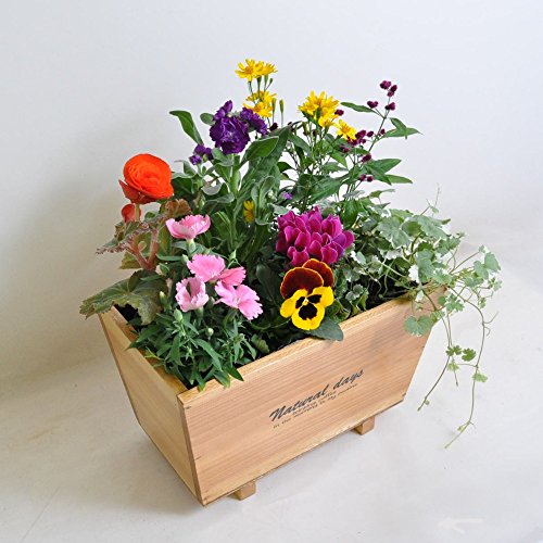 ハンドメイドのため数量限定商品! 10mmの板厚の国産杉を使用したハンドメイドのウッドポットです。店内で1つずつ仕上げた商品です。水分による腐食や害虫の侵入を防ぐために、脚をつけてイます。塗装は3度塗りをしています。 鉢植えは切花と違って1シーズンお楽しみ頂けます。花の種類によっては翌年も花を咲かすことできるものもございます。お届け時には3~5分咲きです。少し華やかさにはかけますが、蕾が開花していく様子を楽しんで頂きたいと思います。お手入れの方法については、商品に「お手入れ方法」を添付しておりますので、ご参照下さい。 お花の種類やお色のご指定はお受けできません。