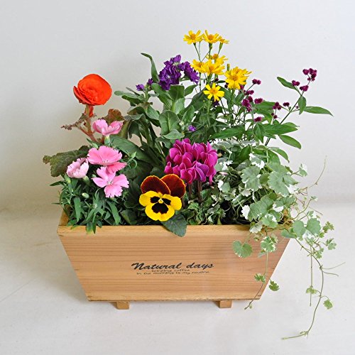 - 季節の苗をを杉の木のウッドポットに寄せ植えアレンジ。受注後、状態の良い種類の花苗を7~8苗使用してプロがアレンジして、根が馴染むまで生産元で管理を行ってから出荷をします。