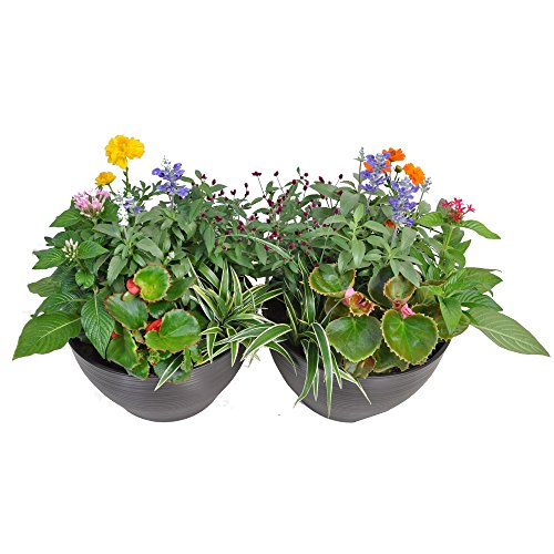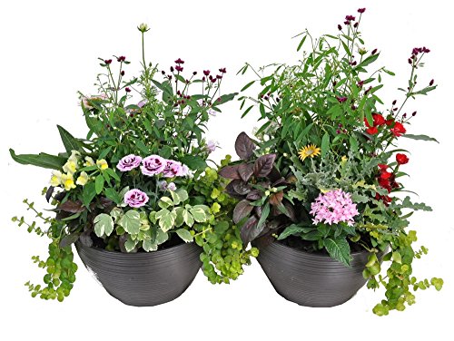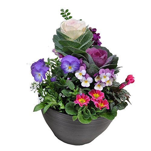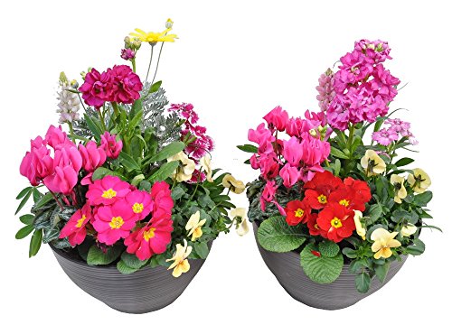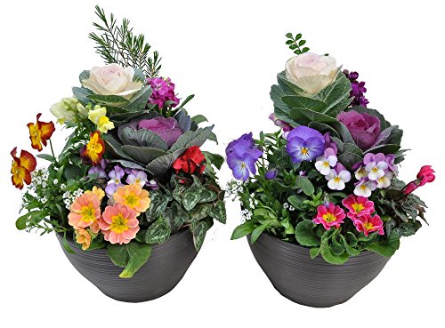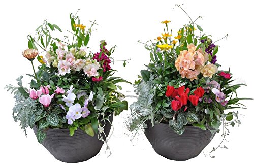 - 季節の苗を5~6種類1鉢に植えこんであります。 対になるようになっておりますので、ほぼ同じお花が入りますが、お花の色の変更や構成によってお花を若干変更させていただくことがあります。