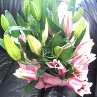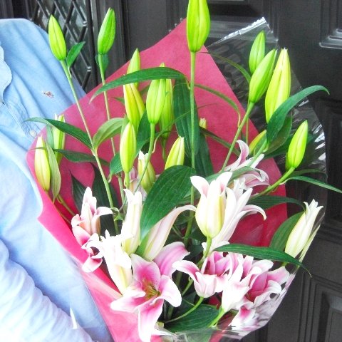 - ソルボンヌなどピンクのオリエンタル百合3本12輪以上の花束