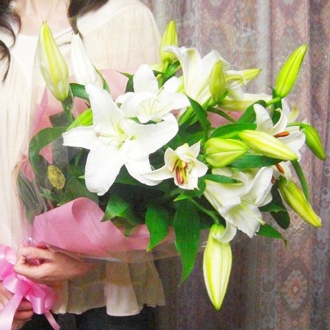 5本約25輪のオリエンタル百合の花束!画像はイメージでつぼみ付の状態でのお届けとなります。香り花型とも優雅な百合の女王さま。次々と開花して長く楽しめるのでお勧めです。1本4~6輪の花がついています、70cm位の花束です。