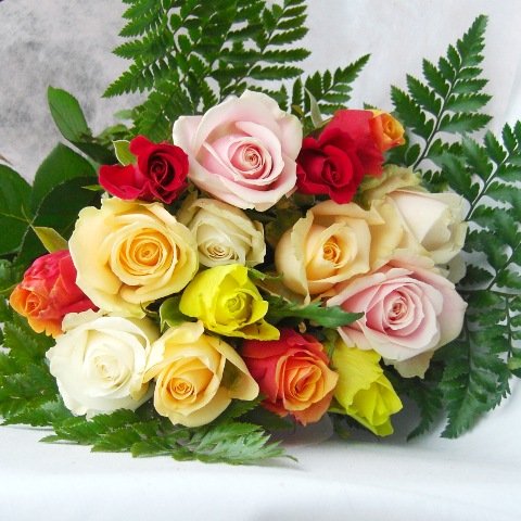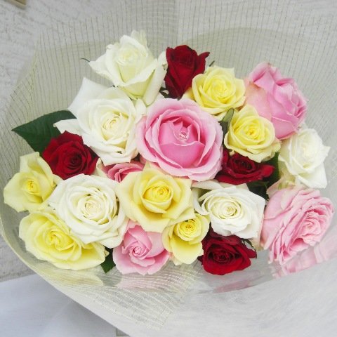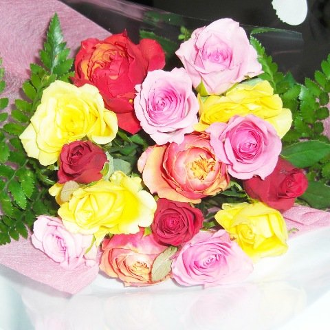 花with-heart母の日、誕生日、記念日に贈っても贈られても嬉しいバラ、色お任せで12本のミックス薔薇の花束。