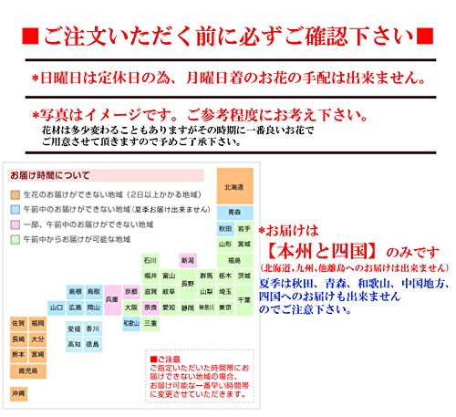 - ■お昼12:00迄のご注文で最短翌日配送。■お届け日時指定できます。【日曜定休日の為、月曜日着のお花の手配は出来ません。】■時間指定された場合でも配送業者の諸事情などにより指定時間内に配達ができない事もございますので予めご了承ください。