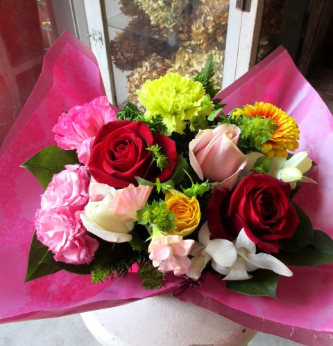 - ■一番人気の花【薔薇】がメインのアレンジメント■ブライダルなどにも使用される国産薔薇5本と季節のお花でアレンジしております!■写真はイメージです。入荷状況により色合い等は多少異なる場合もございますので予めご了承ください。