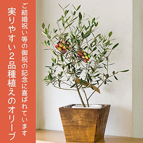 ただいま新苗につき写真より少し小さいです。ご希望のお客様には領収書をご用意致します。 商品の仕様 植物について オリーブ (2品種植え) 科名:モクセイ科 属名:オリーブ属 性質:常緑樹 使われている器 5号プラスチック鉢植え(直径15cm×高さ13cm)木製鉢カバー(横幅20cm×奥行20cm×高さ16cm) 商品のおおよその大きさ 器を含んだ全体の高さ約30cm~50cm程度(個体差が若干ございます) 付属品 栽培の手引き(目安になります) 日常の管理方法 置き場所 日当りが良くて風通しの良いところ、風通しが悪いところに置かれると株が痛んで元に戻らない事があります。 あまり温度が高くない所の方が花もちは良いです。 水やり 植えられている土の表面が乾けば、中の植木鉢ごと取り出して土に直接水差しやジョウロでたっぷりと、水が流れても大丈夫な所で土が全部完全に湿るまで与えます。 肥料 市販の園芸用肥料を定期的に適量与えます。与える頻度や量は使われる肥料により異なりますので、肥料にあります注意書きの通りお使いください。 その他 伸び過ぎた茎は適度に切り戻して頂いて大丈夫です。枯れた花や葉は切り取って頂きます。 お読みください 納期が決まり次第、こちらからお届け日をお知らせ致します。商品の性質上、生ものでございますので長期ご不在の場合は再配達が不可能となります。配送不能になる場合はキャンセル料が発生いたします。お代金の全額をご負担頂きます。配送はヤマト運輸または佐川急便からお選び頂けます。地域によりご希望に添えない場合もございます。現物販売ではございませんので形状が掲載商品と異なる場合もございます。予めご了承くださいませ。生産状況によりご希望日にお届け日できない場合もございます。 □お届けはご希望に添えない場合もございます。