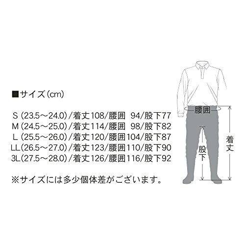 Sサイズ(23.5cm~24.0cm)/着丈108cm/腰囲94cm/股下77cmMサイズ(24.5cm~25.0cm)/着丈114cm/腰囲98cm/股下82cmLサイズ(25.5cm~26.0cm)/着丈120cm/腰囲104cm/股下87cmLLサイズ(26.5cm~27.0cm)/着丈123cm/腰囲110cm/股下90cm3Lサイズ(27.5cm~28.0cm)/着丈126cm/腰囲116cm/股下92cm