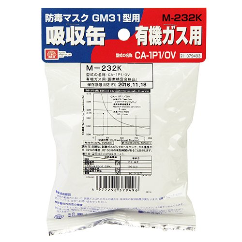 ●【用途】防毒マスクGM31型用吸収缶(有機ガス用CA-1P1/OV)。【特徴・機能】防毒マスクGM31型 M-232用吸収缶になります。通気抵抗(Pa):110以下。除毒能力・シクロヘキサン(0.03%)(分):100以上。重量(g):60.0以下。試験ガスがシクロヘキサンで、ガス濃度が0.02%の場合、約150分の有効時間があることを示します。【注意事項】有機ガス・蒸気専用です。その他の環境で使用する場合は、製造元にお問い合わせください。袋に記載の注意事項をお読みになり正しくご使用ください。