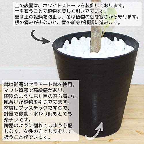 - 鉢は話題のセラアート鉢を使用。マット質感で高級感があり、陶器のような見た目の落ち着いた風合いが植物を引き立てます。材質はプラスチックですので、計量で移動・水やり時もとても楽チンです。陶器のように割れてしまう心配もなく、女性の方でも安心して扱うことができます。土の表面は、ホワイトストーンを装飾しております。土を覆うことで植物を美しく引き立てます。