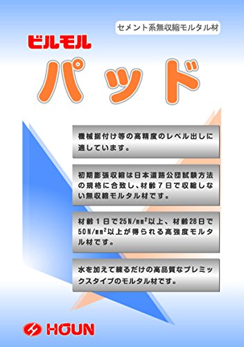 ビルモルパッドは、機械の据付けなどのレベル出しに適したセメント系無収縮モルタル材です。 水を加えて練るだけのプレミックスタイプです。