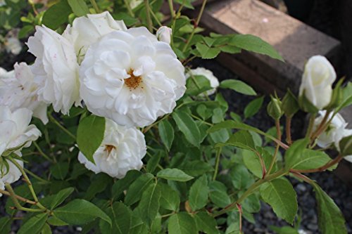 花は清楚なホワイト。ひと枝に数輪ずつが房になって咲き、黄色いしべをのぞかせながら、春、豪華に咲き誇る。株元からのシュートが出にくいが、古枝でも老化しにくく、何年にも渡ってよく花がつく。また、晩秋以降にも、繰り返し咲きやすい。トレリスや壁面に最適で、パーゴラにも向く