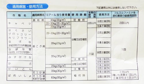- ・キャベツ、はくさい、ブロッコリー、かぶなどの根こぶ病や、ばれいしょのそうか病防除に有効です。
