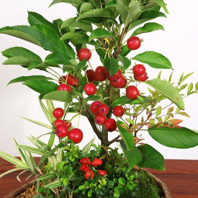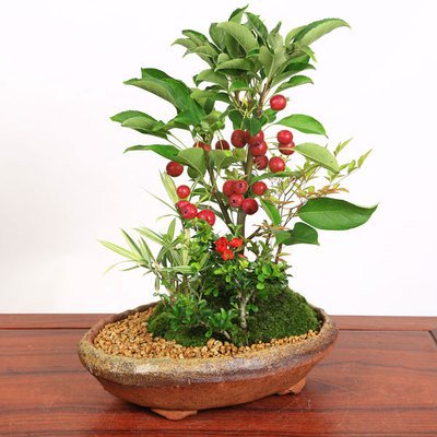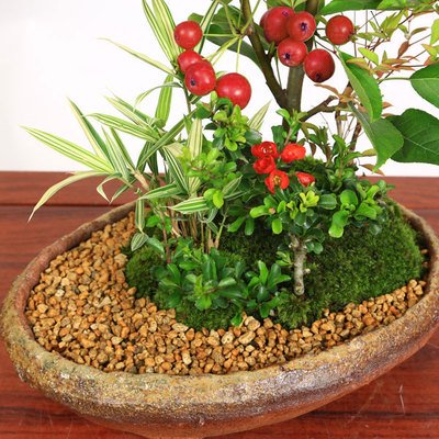 - 樹種:姫りんご・長寿梅(チョウジュバイ)・南天・縞笹の寄せ植え (鉢は信楽焼小鉢)
