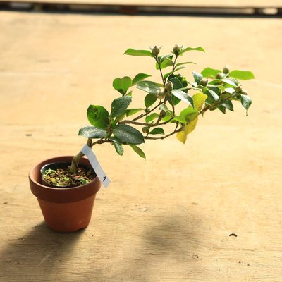 - 常緑低木。 曲付されて盆栽向きの寒椿です。11-12月頃にお花をさかせます。