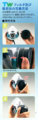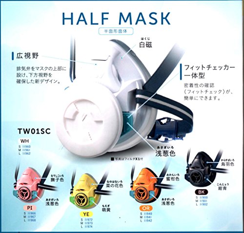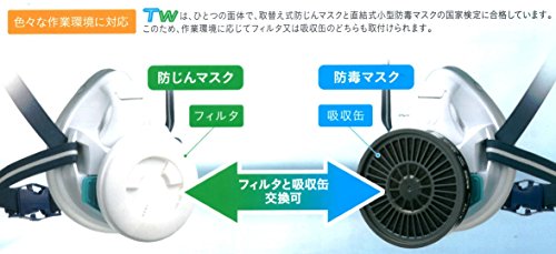 取替え式防じんマスク・直結式小型防毒マスク「TW01SC」面体のみ(フィルター、吸収缶は別売) ■軽量・小型:質量115g以下 ■シリコーン製:肌に優しい素材 ■メタルフリー:金属部品を使用していません。■広視野:排気弁をマスクの上部に設け、下方視野を確保した新デザイン。■フィットチェッカー一体型:密着性の確認(フィットチェック)が簡単にできます。■色々な作業環境に対応:「TW」はひとつの面体で、取替え式防じんマスクと直結式小型防毒マスクの国家検定に合格しています。このため、作業環境に応じてフィルター又は吸収缶のどちらも取り付けられます。 ■型式検定合格番号:●防毒マスク(面体):第TN508号 ●防じんマスク(面体+T2フィルター):第TM652号