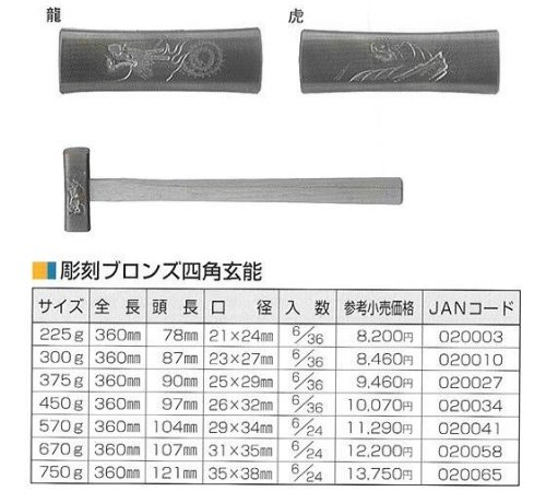 王将 木柄玄能・金鎚 彫刻ブロンズ四角玄能 570g