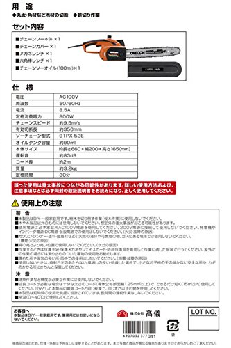 ●丸太・角材など木材の切断●薪切り作業●OREGON製ソーチェーン・ガイドバー使用●チェーンオイル自動注油式●安全ロックボタン付き●オイル残量がひと目でわかるオイル点検窓付き●本体●チェーンカバー●メガネレンチ●チェーンソーオイル(100ml)●六角棒レンチ●電圧:AC100V●周波数50/60Hz●電流:8.5A●定格消費電力:800W●チェーンスピード:約9.5m/s●有効切断長:約350mm●ソーチェーン型式:91PX-52E●オイルタンク容量:約90ml●本体サイズ:約長さ660×幅200×高さ165mm●運転音:約83dB●コード長:約2m●質量:約3.2kg●定格時間:30分●パッケージサイズ:185×705×215●パッケージ重量:4300