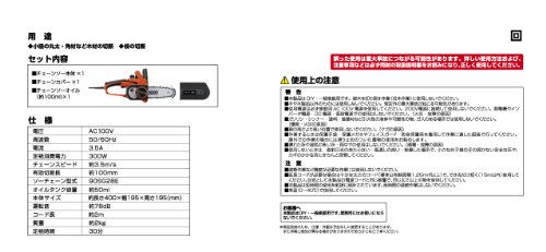 ●小径の丸太・角材など木材の切断●枝の切断●OREGON製ソーチェーン・ガイドバー使用●枝を逃がさずラクラク切れる枝ガイド付●コンパクトで軽量。●女性でも扱いやすい軽さ●工具不要でソーチェーンの調整・交換が簡単●チェーンオイル自動注油式●安全ロックボタン付き●オイル残量がひと目でわかるオイル点検窓付き●本体●チェーンカバー●チェーンソーオイル(約100ml)●電圧:AC100V●周波数50/60Hz●電流:3.5A●定格消費電力:300W●チェーンスピード:約3.5m/s●有効切断長:約100mm●ソーチェーン型式:90SG28E●オイルタンク容量:約50ml●本体サイズ:約長さ400×幅195×高さ195mm●運転音:約78dB●コード長:約2m●質量:約2kg●定格時間:30分●パッケージサイズ:210×450×205●パッケージ重量:2850