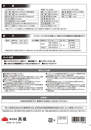 ●ネジ・ボルト・ナットなどの締め付け・ゆるめに●木材・樹脂の穴あけに●リチウムイオンバッテリー2個付属●持ち運び、収納に便利なトート型キャリーバッグ付属●インパクトドライバー本体×1●14.4V専用充電器(BC-1405Li)×1●14.4V専用バッテリーパック(BP-1405Li)×2●キャリーバッグ×1●6.35mm六角軸両頭ビット(+No2×65mm)×1●【本体】●回転数:約0~2500min?1(無段変速)●打撃数:約0~3200回/分●最大トルク:約100N・m(約1020kgf・cm)●モーター電圧:DC14.4V●ビット差込口:6.35mm六角軸●本体サイズ:約長さ160×幅65×高さ218(mm)●質量:約1.13kg(バッテリーパック含む)【充電器】●電圧:AC100V●周波数:50/60Hz●消費電力:50VA●出力電圧:DC14.4V●出力電流:1.5A●充電時間:約1時間●コード長:約1.8m【バッテリーパック】●電池種類:リチウムイオン●電圧:14.4V●容量:1.3Ah●パッケージサイズ:235×315...