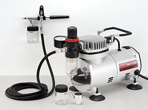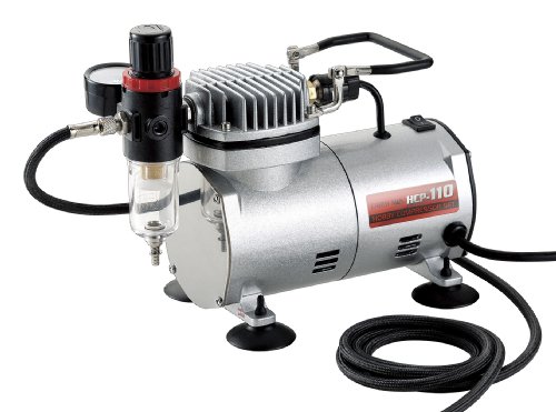 - セット内容:ホビーコンプレッサー本体、エアーホース(約2m)、エアブラシ(吸い上げ式)、22mlボトル(吸上管付)、22mlボトル、5mlメタルカップ、レンチ、ハンガー、ケース(エアブラシセット用)