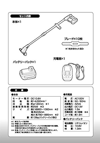 - セット内容:本体、ブレード10枚付(本体に1本セット済)、充電器、バッテリーパック