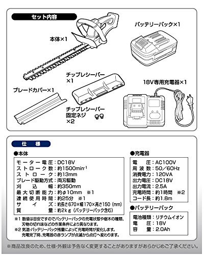 - セット内容:本体×1、ブレードカバー×1、チップレシーバー×1、チップレシーバー固定ネジ×2、バッテリーパック×1、18V専用充電器×1