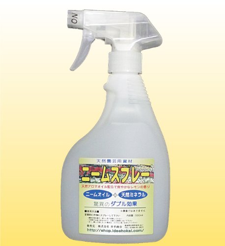 鉢植えやお庭のガーデニングに最適な『ミネラル入りニームスプレー』です。 使い方は簡単で、鉢植えやプランターなどにシュッとスプレーするだけ! 即効性はありませんが、2-3日するとニームの効果が現れてきます。 また、天然ミネラル『天然ミネラル-1』を配合し、成長促進効果もプラスしました。 もちろん、全ての植物・鉱物起源の材料で作られていますので、安心・安全です。 また、レモングラスを配合することにより、ニーム独特の嫌な匂いがありません。 レモンの爽やかな香りがします。 3-4日おきに定期的にスプレーするとニームの効果を持続することが出来ます。 作物の植え付け時や鉢の上にニーム顆粒を撒いて併用するとさらに効果的です。 ※「ミネラル入りニームスプレー」は農業用土壌改良資材です。農薬・殺虫剤ではございません。