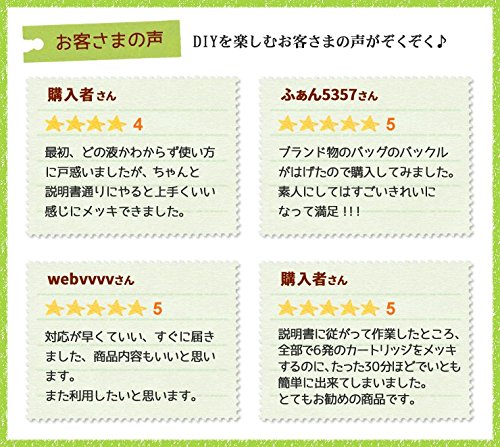 [ アイディアで多彩な用途 ] ホビー:趣味の彫金やワイヤーアート、楽器、オブジェ。 アクセサリー:銀製品(シルバー)の変色防止(ロジウム)。ベルト、鞄のバックルやファッションリング、チェーンその他、メッキの修理・補修で輝きを蘇らせましょう。 生活関連:洋食器やテーブルウェア、めがね、時計バンド、ブレザーの金釦、各種カギなどのメッキ剥がれの修理・補修。 プロユース:試作品や、小ロット生産品の仕上げ、メッキの一部修理・補修など、メッキ職人さんも利用。 カー用品、オーディオ端子:自動車キーをお好きな色へ。端子への白金めっきは最高です。 DIY:自作のDIY作品の金具、キーホール、飾り金具などをめっきで美しく。愛用の道具、工具や学校教材にも。 標準セット内容(金、ニッケル、銅、脱脂液、金属磨き 各18ml。筆、筆先3本、フェルト16個、取扱説明書) [ めっきの種類 ] (別売液も含む) 銅、ニッケル(銀色)、24K金(標準)、24K金(厚付)、すず(光沢)、すず(半光沢)、亜鉛、黒ニッケル、白金、ロジウム、銀 ◎私たち「日清工業は本職のめっき会社」です。 [ めっきの出来る物と、出来ない物 ]1.金属以外の物にメッキすることは出来ません。(プラスチック、ガラス、陶磁器、木、紙、布など) 2.アルミ、チタン、亜鉛、亜鉛メッキを施した製品などにはめっき出来ません。 3.鉛、はんだ、ホワイトメタル、アンチ製品にメッキするのは困難な場合があります。 (鉛、はんだ上には別売のすずめっき液でめっきした後に他のめっきを施すことが出来る場合があります) 4.ステンレス、あるいはニッケルめっき上にクロムめっきを施している製品には、別売のステンレス前処理液が必要です。 (クロムめっきの場合、クロム層を剥がすことになります。ステンレスは材質によって、ムラが生じる場合が有ります) 5.銅および、銅合金(真鍮、洋白など)へのめっきは比較的簡単です。 6.鉄にはさまざまな材質が有り、まれにめっきののりにくいものも有ります。 ☆材質が不明な場合は、製品の裏側などの見えない部分でめっきののり具合を確かめてから、行うことをお勧めします。