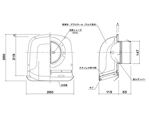 防音型フード付ガラリ(防火ダンパー付) ステンレス網付シルバー SK-SGFB150D 新協和