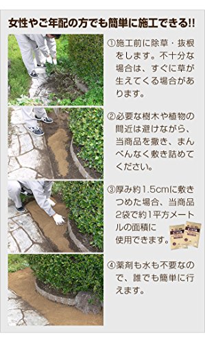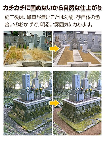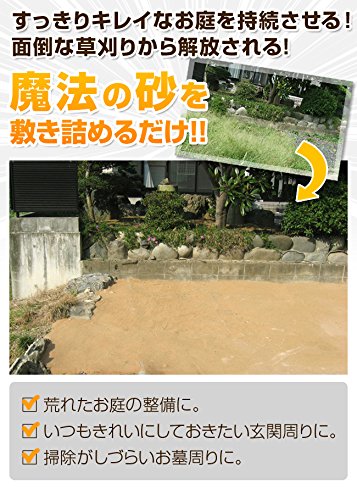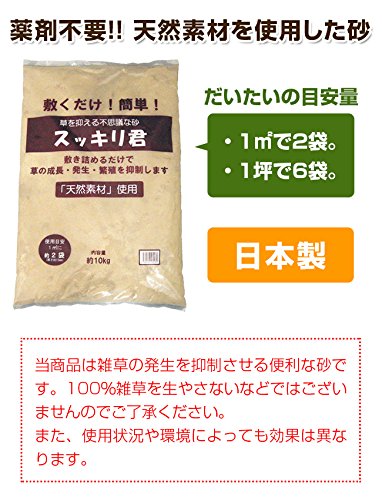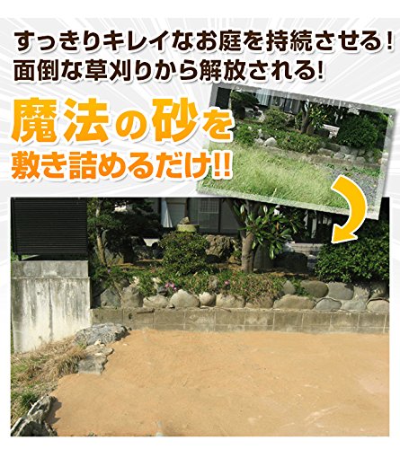 - 固めるタイプではなく、さらっと自然な仕上がりになるタイプです。この砂を敷き詰めるだけで雑草の発生を抑制させる便利な草対策グッズです。日本製なので安心安全です。1平方メートルで2袋(20kg相当)、1坪で6袋(60kg相当)を目安としてお買い求めください。