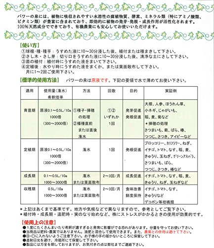 - 使用上ご注意:一度にたくさんまいたり、希釈が濃すぎると発育に影響が出る恐れがあります。分量を守ってご使用下さい。当製品は肥料、農薬ではございません。液肥と混合してご使用いただけます。農薬との併用は避けて下さい。